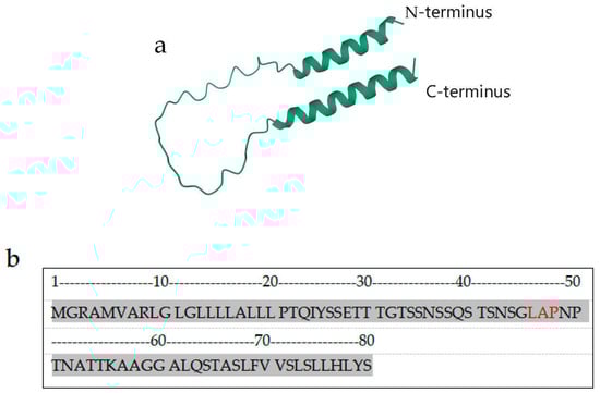 Structure of human CD24. (a) Schematic showing the predicted peptide structure of human CD24 from NCBI (Protein code: P25063), showing the N-terminus of the peptide chain at the top and the C-terminus of the peptide chain at the bottom. (b) Schematic showing the primary structure of the CD24 protein: the first amino acid is the N terminal, the 80th amino acid is the C terminal, and the red letters are the LAP sequence of the binding site of the anti-CD24 antibodies ALB9 and SWA11.