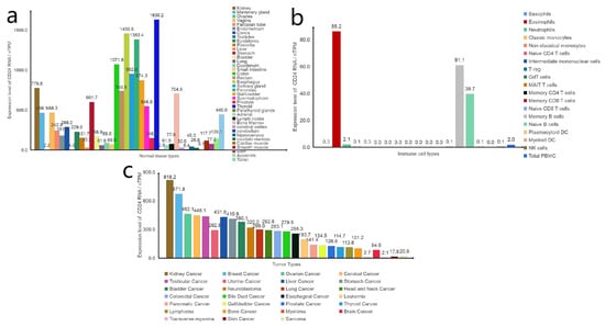 Expression levels of CD24 RNA. (a) Expression levels of CD24 RNA in different normal tissues. (b) Expression levels of CD24 RNA in different immune cells. (c) Expression levels of CD24 RNA in different tumours. Data from the “The Human Protein Atlas” database.