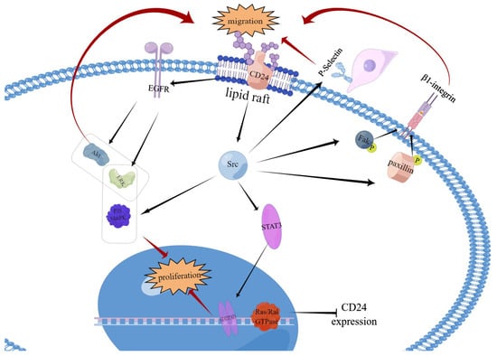 Protein tyrosine kinase Src, particularly c-Src, is often overexpressed in a range of cancers and can be a significant factor in tumour progression [24,25]. The connection between CD24 and Src in relation to their location and function has been gradually recognised [26,27] (Figure 3). The methods by which CD24 supports tumour progression via Src are explained as follows.
