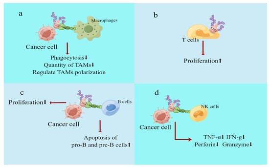 In vivo, immune cells have a crucial function in monitoring and eradicating cancer cells. Nevertheless, tumours can avoid the detection of the immune system via different mechanisms [54]. For instance, numerous cancer cells express CD24 extensively, and CD24 on cancer cells can attach to its ligand, Siglec-10, on multiple immune cells and then emit a “don’t eat me” signal to the innate cancer-suppressing immune cells, particularly macrophages, thereby reducing the immune cells’ phagocytosis of cancer cells. Similar to CD47 and PD-L1, CD24 serves as an innate immune checkpoint in which cancer cells impede the immune function of immune cells and influence the behaviour of specific immune cells, mainly through the CD24-siglec10 pathway. Additionally, many immune cells express CD24 themselves, thus CD24’s existence also influences the proliferation, apoptosis, and function of said immune cells. These immune cells comprise macrophages, T cells, B cells, NK cells, iNKT cells, and others. The subsequent section will elaborate on the effects of CD24 on these immune cells (Figure 4).