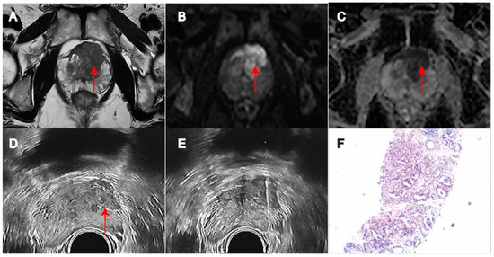MRI/transrectal ultrasound fusion-guided transrectal target biopsy revealed Gleason 8 (Grade Group 4) prostate cancer in PI-RADS 5 lesion in peripheral transition zone of prostate (red arrow). (A) T2WI. (B) DWI. (C) ADC. (D) Transrectal ultrasound biopsy. (E) Target Biopsy. (F) PCa on pathology (H&E × 100).