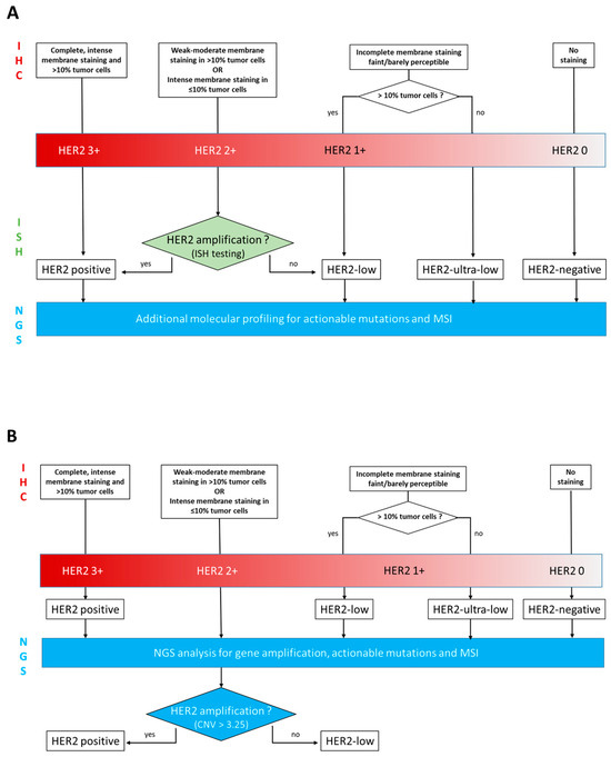 - Zhang, H.; Katerji, H.; Turner, B.M.; Audeh, W.; Hicks, D.G. HER2-low breast cancers: Incidence, HER2 staining patterns, clinicopathologic features, MammaPrint and BluePrint genomic profiles. Mod. Pathol. 2022, 35, 1075–1082. [Google Scholar] [CrossRef]