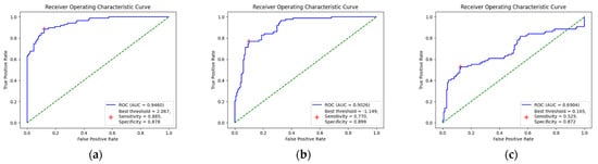 The area under the receiver operating characteristics curves of deep learning models to predict the common peroneal nerve injury magnetic resonance image in the test dataset. (a) EfficientNet-B5, (b) ResNet152, and (c) VGG19. AUC, area under the receiver operating characteristics curve; ROC, receiver operating characteristics.