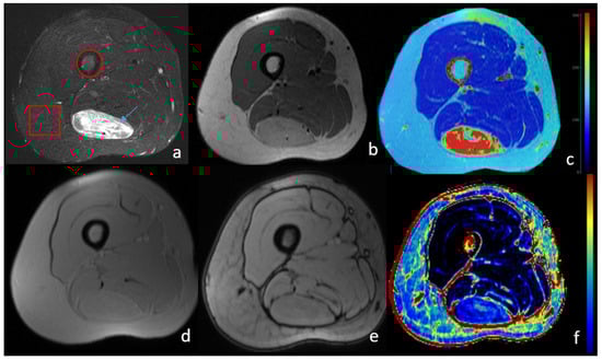 MRI image of lower limb with a brown fat lipoma (hibernoma). Histopathologic examination showed 90% of brown fat composition. The arrow shows the hibernoma mass, while the circle and square denote the bone marrow area subcutaneous fat depot, respectively. (a) T1-weighted with fat suppression; (b) T2- weighted; (c) T2 relaxometry parametric map calculated from multi echo T2 images. Brown fat lipoma exhibits high T2 relaxation rates due to the water component of the brown fat composition; (d) T1 in-phase; (e) T1 out-of-phase; (f) fat fraction map calculated from in- and out-of-phase images. Muscle shows minimal fat fraction, while a higher degree is observed for the bone marrow. Hibernoma exhibits smaller fat fraction, which is in accordance to the histopathologic examination showing BAT dominance over white adipocytes. Subcutaneous fat appears with lower fat fraction than the bone marrow as the technique is unable to quantify percentages of more than 50% fat dominance.
