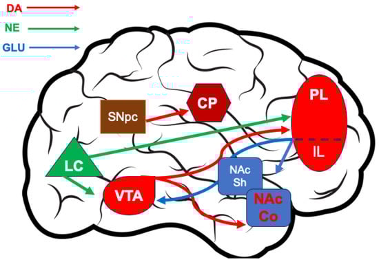 Schematic representation of the main brain areas and connections of interest in this review: Dopaminergic neurons from the ventral tegmental area (VTA) project to the medial prefrontal cortex (mpFC)’s prelimbic (PL) and infralimbic (IL) subregions, along with the nucleus accumbens shell and core (NAcSh and NAcCo, respectively), all involved in specific ways in cognition, emotion, and motivation finalized to adaptive behavior. Dopamine projections from the substantia nigra pars compacta (SNpc) to the striatum (caudate–putamen, CP) are involved in voluntary movements, and their crucial role in Parkinson’s disease (PD) is well known. Moreover, the nigrostriatal system is crucial in behavioral disorders characterized by loss of flexibility, as well as in compulsive behavior characterizing neurodegenerative (PD) and neuropsychiatric disorders. Dopaminergic neurons in these brainstem regions receive direct and indirect excitatory glutamatergic afferents from the prefrontal cortex. Norepinephrinergic neurons in the locus coeruleus (LC) project to the mpFC where, synergically with dopamine, they modulate dopamine transmission in the accumbens, forming the prefrontal/accumbal catecholamine system []. The LC modulates the VTA, thus influencing dopamine transmission. DA: dopamine. NE: norepinephrine. GLU: glutamate.