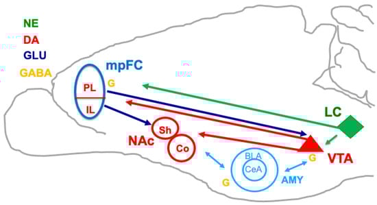 However, we have partially compensated for this limitation by inserting the norepinephrinergic system into the dopaminergic system, with specific reference to the role of NE in the mpFC, which exerts a stimulating action on dopaminergic transmission in the NAc, while also forming a prefrontal/accumbens catecholamine system []. Therefore, it is a counterpart of prefrontal cortical dopaminergic transmission.