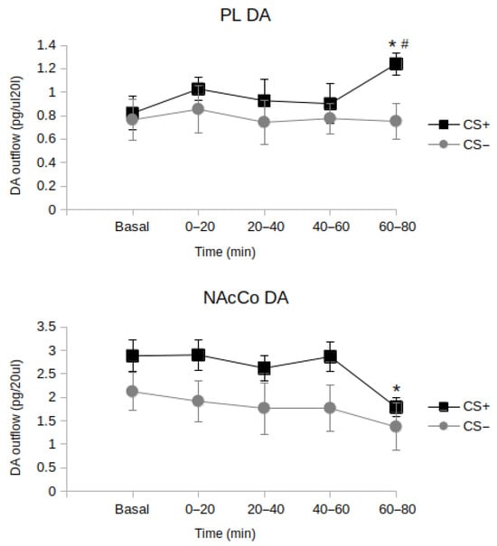 Effects of 80 min of re-exposure to CS+ or CS− on DA outflow in the prelimbic prefrontal cortex (PL) and nucleus accumbens core (NAcCo). CS+ = chamber associated with AMPH. CS− = chamber associated with saline. Results are expressed as pg/20 µL concentration (means ± SE); * p < 0.05 in comparison with basal levels, # p < 0.01 in comparison with CS− in the corresponding time block.