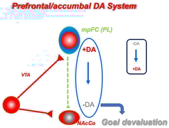 Evidence shows that the NAcCo subregion plays a crucial role in the extinction of rewarding or aversive CSs, and that the extinction of CSs to rewarding UCSs leads selectively to relevant neuroplasticity in the NAcCo, as expressed by increased BDNF levels []. Remarkably, DA in the NAcCo is moderated by the prelimbic portion of the mpFC and the PL, and the mpFC’s cortical DA plays a major role in cognitive flexibility and in the individual adaptive responses to changes occurring in the external environment, as well as being crucial in the extinction of aversive and appetitive experiences.
