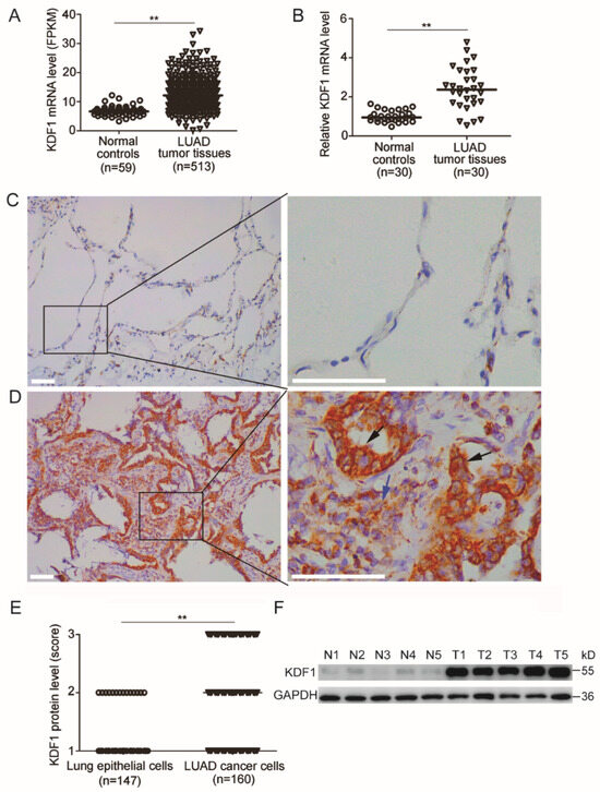 Expression of KDF1 in lung adenocarcinoma (LUAD) tissue. The expression of KDF1 was analyzed by using the data downloaded from TCGA database, quantitative PCR (qPCR), immunohistochemistry and Western blot methods. (A) Results of analysis based on the transcription data downloaded from TCGA database. (B) Results of qPCR analysis. (C) A representative image of KDF1 immunohistochemical staining in adjacent non-tumor lung tissues shows that KDF1 was weakly expressed by lung epithelial cells. (D) A representative image of KDF1 immunohistochemical staining in LUAD tumor tissues showing that enhanced KDF1 was expressed in the cancer cells (shown by black arrow) and some non-cancer cells (shown by blue arrow). (E) Results of statistical analysis of KDF1 protein level in non-tumor epithelial cells and LUAD cancer cells based on immunostaining intensity score. (F) Results of Western blot showing a marked increase in the expression level of KDF1 protein in LUAD tumor tissue samples in comparison with the paired non-tumor lung tissue samples. N1–N5: Non-tumor lung tissue samples; T1–T5: LUAD tissue samples. ** p < 0.01.