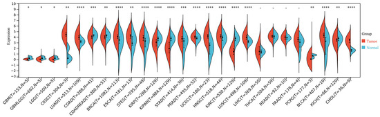 To obtain a full view of KDF1 expression in cancers, we carried out a pan-cancer analysis using the SangerBox platform (http://sangerbox.com/ (accessed on 26 June 2023)). As demonstrated in Figure 2, KDF1 was observed to be differentially expressed in 22 out of the 26 types of cancers analyzed. It was upregulated in 12 cancers and downregulated in 10 cancers, indicating that KDF1 might be extensively involved in the pathogenesis and carcinogenesis.
