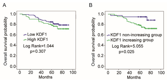 According to the absolute immunostaining intensity of KDF1, patients were divided into low- (with KDF1 score being 1 or 2) and high-KDF1 (with KDF1 score being 3) groups. As shown in Figure 3A, no significant difference in OS was observed between low- and high-KDF1 groups (p = 0.307), but a trend of worse prognosis was observed in the high-KDF1 group. The survival observation time was considered as the time from diagnosis to final follow-up. Considering that genetic background differences in different patients may affect KDF1 expression, which may interfere with our observations of the pathological significance of KDF1 expression levels, we further compared the expression levels of KDF1 in cancer cells and paired adjacent non-neoplastic lung epithelial cells; and based on whether KDF1 levels were higher in cancer cells than in adjacent non-neoplastic lung epithelial cells, patients were divided into KDF1-increasing group and KDF1-non-increasing groups. As shown in Figure 3B, we observed a significantly shorter OS in the KDF1-increasing group compared with the KDF1-non-increasing group.