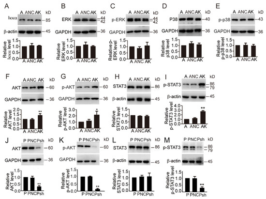 Effect of KDF1 on the cellular level of tumor-associated protein. Western blot analysis of Iκκα (A), ERK (B), phosphorylated ERK (C), p38 (D), phosphorylated p38 (E), AKT (F,J), phosphorylated AKT (G,K), STAT3 (H,L) and phosphorylated STAT3 (I,M) in LUAD cells. A: Uninfected A549 cells; ANC: Control-virus-infected A549 cells; AK: A549 cells overexpressing KDF1. P: Untransfected PC-9 cells; PNC: PC-9 cells infected with the control virus; Psh: PC-9 cells with low KDF1 expression. * p < 0.05 vs. A or P; ** p < 0.01 vs. A or P.
