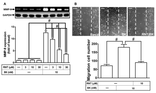 RNT suppresses BK-induced MMP-9 expression and cell migration in RBA-1 cells. (A) RBA-1 cells were treated with varying concentrations of RNT (3, 10, or 30 μM) for 1 h, followed by stimulation with BK (10 nM) for 24 h. Gelatin zymography assessed MMP-9 levels in media, while Western blot analyzed GAPDH as an internal control in cell lysates. (B) Cells were pretreated with or without RNT (10 μM) for 1 h and then exposed to BK (10 nM) for 48 h. The migratory cell count was determined. Data represent the mean ± SEM of at least three independent experiments. # p < 0.05 compared with cells treated with vehicle or BK, as indicated. Scale bar 200 μm.