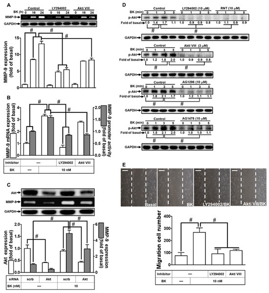 RNT suppresses BK-induced MMP-9 expression and cell migration via PI3K/Akt inhibition. (A) Cells were pretreated with 10 μM LY294002 or 3 μM Akti VIII for 1 h, followed by stimulation with BK (10 nM) for 16 and 24 h. MMP-9 levels were determined by gelatin zymography. (B) Cells were pretreated with 10 μM LY294002 or 3 μM Akti VIII for 1 h and then exposed to BK (10 nM) for 6 h. MMP-9 mRNA levels and promoter activity were determined. (C) Cells were transfected with scrambled (Scrb) or Akt siRNA and then exposed to BK (10 nM) for 24 h. MMP-9 levels were analyzed by gelatin zymography, and GAPDH and Akt levels were assessed by Western blot. (D) Cells were pretreated with or without 10 μM AG1296, 10 μM AG1478, 10 μM LY294002, 3 μM Akti VIII, or 10 μM RNT for 1 h, followed by BK (10 nM) challenge for indicated time intervals (1, 3, and 5 min). Phosphorylated Akt levels were determined. (E) Cells were pretreated with or without 10 μM LY294002 or 3 μM Akti VIII for 1 h and then exposed to BK (10 nM) for 48 h. The migratory cell count was determined. Data represent the mean ± SEM of at least three independent experiments. # p < 0.05 compared with cells treated with vehicle or BK, as indicated. Scale bar 200 μm.