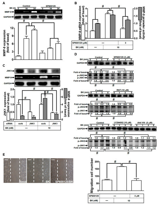 Regulation of BK-induced MMP-9 expression and cell migration by JNK1/2 signaling in RBA-1 cells. (A) Cells were pretreated with 3 μM SP600125 for 1 h, followed by stimulation with BK (10 nM) for 16 and 24 h. MMP-9 levels were assessed through gelatin zymography. (B) Cells were pretreated with 3 μM SP600125 for 1 h and then exposed to BK (10 nM) for 6 h. MMP-9 mRNA expression and promoter activity were measured. (C) Cells were transfected with scrambled (Scrb) or JNK1 siRNA and then exposed to BK (10 nM) for 24 h. MMP-9 levels in the media and cell lysates were determined using gelatin zymography. Additionally, GAPDH and JNK1 levels were assessed through Western blot. (D) Cells were pretreated with or without 3 μM SP600125, 10 μM LY294002, 3 μM Akti VIII, or 10 μM RNT for 1 h and then challenged with BK (10 nM) for indicated time intervals. Levels of JNK1/2 phosphorylation were determined by Western blot. (E) Cells were pretreated with or without 3 μM SP600125 for 1 h and then exposed to BK (10 nM) for 48 h. Migratory cell count was determined. Data represent the mean ± SEM of at least three independent experiments. Significant differences (# p < 0.05) were observed compared with cells exposed to the vehicle or BK, as indicated. Scale bar 200 μm.