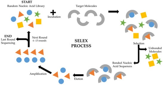 Nucleic-acid-based aptamers are developed through a process called Systematic Evolution of Ligands by Exponential enrichment (SELEX), as outlined in Figure 1 [10,25]. SELEX comprises a series of iterative steps, involving selection, elution, and amplification, with the goal of identifying aptamers that strongly bind to a specified target molecule [26]. The process starts with the creation of a diverse library of nucleic acid molecules, often up to approximately 1014 different molecules [26], typically single-stranded DNA or RNA, characterized by random sequences to encompass a wide array of possibilities. Subsequently, this initial library is mixed with the target molecule, and the unbound nucleic acid sequences are separated from those that interacted with the target. The latter group is then eluted and amplified through polymerase chain reaction (PCR) for DNA libraries or reverse-transcription PCR for RNA libraries, leading to the generation of numerous copies of sequences that have demonstrated an affinity for the target. These amplified sequences serve as the foundation for the subsequent selection round, a process that is repeated through multiple rounds, usually ranging from six to fifteen. After multiple selection rounds, the resulting pool of sequences is analysed and subjected to sequencing, and those demonstrating the highest specificity and affinity for the target are singled out and deemed potential aptamers.