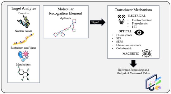 Schematic diagram showing the operating principle of an aptasensor. The target molecule binds to the aptamer, generating a signal that is detected by a transducer element. This signal is then processed, and a measurable value is obtained. FET—field-effect transistor; SPR—surface plasmon resonance; SERS—surface-enhanced Raman scattering.