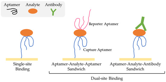As aptamers have been chosen to interact with a broad spectrum of targets, encompassing small molecules and large macromolecules like proteins, diverse assay configurations have been designed and reported [100]. These configurations are typically categorized into two groups: single-site binding and dual-site binding, as illustrated in Figure 3.