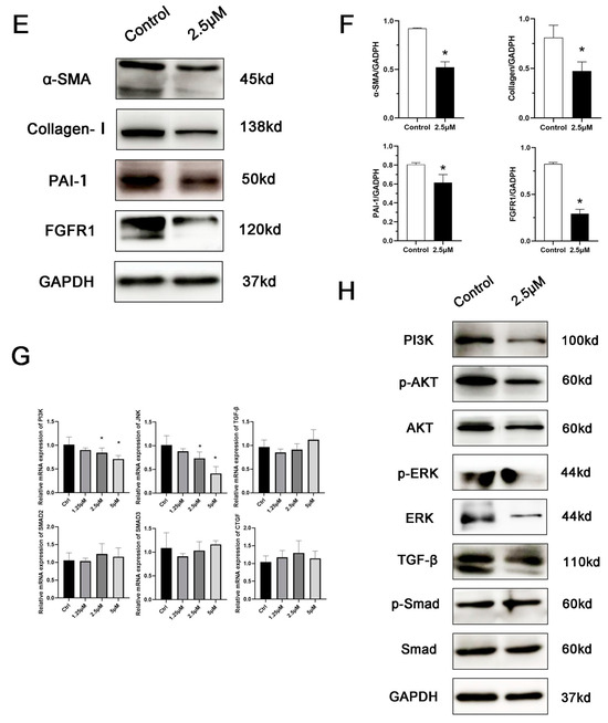 As demonstrated by the Western blot (Figure 3E), treatment with the drug significantly suppressed the expression of PAI-1, FGFR1, collagen I, and a-SMA. Additionally, it also suppressed the expression of ERK, p-ERK, p-AKT, and PI3K (Figure 3H), which represented the inhibition of the AKT and ERK signaling pathways. No significant effect was found on TGF-β and SMAD expression levels.