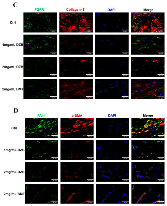 The transplantation of human keloid tissue explanted under nude mouse skin can maintain the pathological state of human keloid cells, which is a suitable animal model for testing candidate anti-keloid drugs [24]. The weight loss of the implanted keloid tissue was averaged: normal saline (59 ± 8.3 mg), 2 mg/mL DZB (104 ± 10.6 mg), 1 mg/mL DZB (92 ± 7.1 mg), and 2 mg/mL BMT (85± 8.8 mg). A statistically significant difference was found between the treated derazantinib group and the control group (Figure 4A). Masson staining and HE staining showed less abundant collagen and micro-vessels in the derazantinib treatment groups (Figure 4B). As demonstrated by the immunofluorescence staining of the keloid tissue explants, the expression of FGFR1 and collagen I was lower in the derazantinib treatment groups than in the control group (Figure 4C). Consistently, the expression of a-SMA and PAI-1 was suppressed in the derazantinib group (Figure 4D).