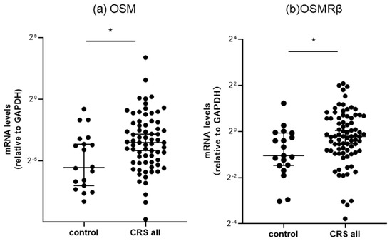 Comparison of mRNA expression in sinus mucosa of the controls and all CRS patients, detected by RT-PCR. The (a) OSM and (b) OSMRβ mRNA levels were quantitatively normalized against GAPDH levels. * p < 0.05. Center lines: median values, error bars: interquartile ranges, CRS: chronic rhinosinusitis.
