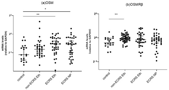 Comparison of the mRNA expression in paranasal sinus mucosa from the controls, non-ECRS patients, and ECRS patients, as detected by RT-PCR. The (a) OSM and (b) OSMRβ mRNA levels were quantitatively normalized against GAPDH levels. * p < 0.05, ** p < 0.01. Center lines: median values, error bars: interquartile ranges, ECRS: eosinophilic chronic rhinosinusitis, NP: nasal polyps.