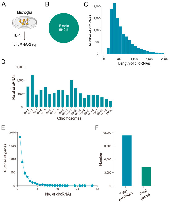 Overview of circRNA profiles in anti-inflammatory microglia: (A) Microglia treatment strategy. (B) CircRNAs derived from exons account for 99.9%. (C) CircRNA length distribution. (D) Schematic diagram of circRNA distribution on chromosomes. (E,F) Correspondence between circRNAs and parental genes.