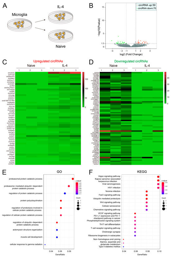Differential expression of circRNAs in IL-4-treated microglia: (A) Sample preparation for circRNA sequencing. (B) Volcano plot of 120 differentially expressed circRNAs. (C,D) Clustering heat map of upregulated and downregulated circRNAs. (E,F) The GO and KEGG analyses of differentially expressed circRNAs.