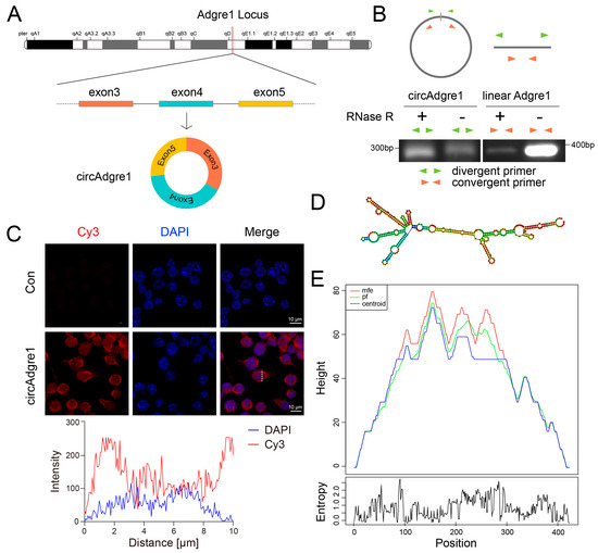 Characterization of the circAdgre1 identity: (A) The formation of circAdgre1 by back-splicing from the host gene. (B) Schematic diagram of nucleic acid electrophoresis and circular formation of total RNA with RNase R treatment. (C) Subcellular localization of circAdgre1 was assessed by FISH and shown to be cytoplasmic. (D,E) The secondary structure of circAdgre1 was predicted by RNAfold web server and displayed as a mountain plot, showing several key loops that might serve as miRNA sponges or RBP binding sites.