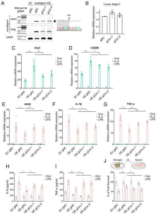 circAdgre1 overexpression promotes anti-inflammatory responses: (A) Validation of overexpression and knockdown efficiency of circAdgre1. The PCR product was sent for sanger sequencing and confirmed that the overexpressed circAdgre1 indeed crossed the BSJ site. (B) The expression level of cognate linear Adgre1 mRNA was detected by real-time qPCR. (C,D) The expression levels of anti-inflammatory markers including Arg1 and Cd206 were assessed by real-time qPCR. (E–G) The expression levels of pro-inflammatory markers including iNOS, IL-1β and TNF-α were assessed by real-time qPCR. (H,I) The concentrations of TNF-α and IL-6 in the culture medium were measured respectively using ELISA. (J) The conditioned medium of microglia cells was harvested for culturing neuron cells, and cell viability was detected by CCK-8 assay. * p < 0.05, ** p < 0.01, *** p < 0.001.
