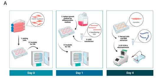 TcDNA-ASOs were transfected into cells using the Lipofectamine LTX (Thermo Fisher Scientific, Rockford, IL, USA) according to the manufacturer’s instructions. Briefly, 24 h before transfection, cells were plated in 6-well plates (1.105 cells per well). The next day, cells were put in differentiation medium and transfected with 100 nM of tcDNA and Lipofectamin LTX reagent. After transfection, cells were incubated for 72 h in differentiation medium before being collected in TRIzol reagent to isolate total RNA, according to the manufacturer’s instructions (Thermo Fisher Scientific, Rockford, IL, USA). A workflow of the transfection analysis is represented in Figure 1A.