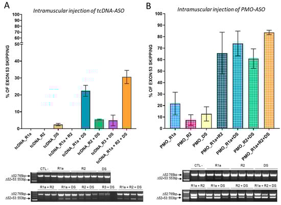 We next evaluated the extent of exon 53 skipping that we could obtain in vivo by injecting the ASO alone or in combination in the tibialis anterior muscle of mdx52 mice. Adult mdx52 mice were injected intramuscularly with a total of 100 µg of tcDNA (either alone or combined) and muscles were harvested 3 weeks later for RNA analysis. RT-qPCR revealed that treatment with single tcDNA ASOs induced only very low levels of exon 53 skipping (<2%) whereas treatment with two or three tcDNAs induced up to 30% exon skipping (Figure 2A). Similarly, intramuscular injection of PMO-ASO indicated that a combination of PMO induced much higher exon skipping (up to 85%) than single PMO (<20%) (Figure 2B). Altogether, these in vivo results confirmed that the combinations of ASOs inducing the highest level of exon 53 skipping were R1a + DS and R1a + R2 + DS.