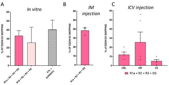 Total RNA was isolated from dissected brain structures, muscles, or cells using TRIzol reagent according to the manufacturer’s instructions (ThermoFisher Scientific, Rockford, IL, USA). For visualization of exon skipping efficacy on gels, aliquots of 1 µg of total RNA were used for RT-PCR analysis using the LunaScript RT SuperMix Kit (New England Biolabs, Evry, France), in a 20 μL reaction. The cDNA synthesis was carried out at 55 °C for 10 min. Next, the PCR was performed from 1.5 µL of cDNA with GoTaq G2 Colorless Master Mix (Promega, Madison, WI, USA) in a 25-µL reaction using the primers Ex-m50F (5′-AGGAAGTTAGAAGATCTGAGG -3′) and Ex-m55R (5′- GGAACTGCTGCAGTAATCTATGA-3′) and the following cycling conditions: 32 cycles of 95 °C (30 s), 58 °C (1 min) and 72 °C (1 min). PCR products were electrophoresed on 1.5% agarose gels and quantified with ImageLab Software version 6.1 (Bio-Rad, Marnes-la-coquette, France).
