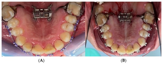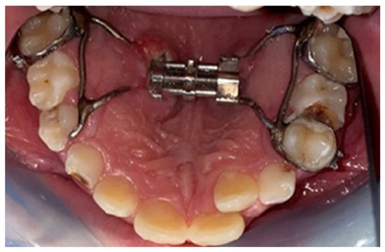 After clinical and radiographical examination, the diagnosis of maxillary constriction was confirmed, and the decision for the rapid palatal expansion treatment method was taken. In the study group, sixteen (n = 16) patients were treated using tooth-borne palatal expanders (Figure 2). The expanders were inserted into the oral cavity of the patients at the level of the posterior third of the hard palate. The palatal expanders were placed 1–3 mm from the palatal mucosa at the time of insertion.