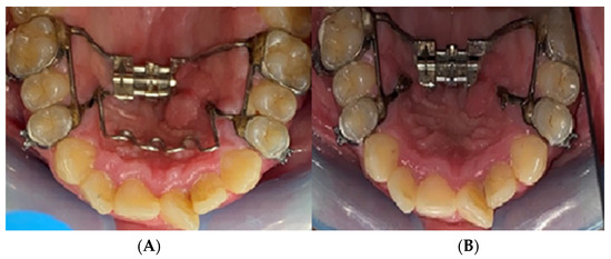 (A) RPE-type expander equipped with a tongue crib to combat infantile swallowing; (B) clinical aspect after the removal of the tongue crib.