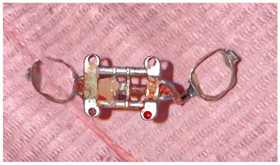 Nine (n = 9) research participants were treated using mini-implant anchorage rapid palatal expanders (MARPE) (Figure 2). The anchorage achieved in these cases was of a hybrid type, made on four mini-implants (Figure 3) inserted into the patient’s hard palate and bilaterally on the first molar and/or first premolar by means of metal rings.