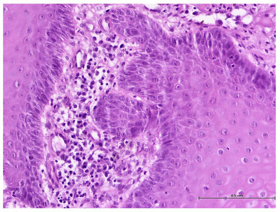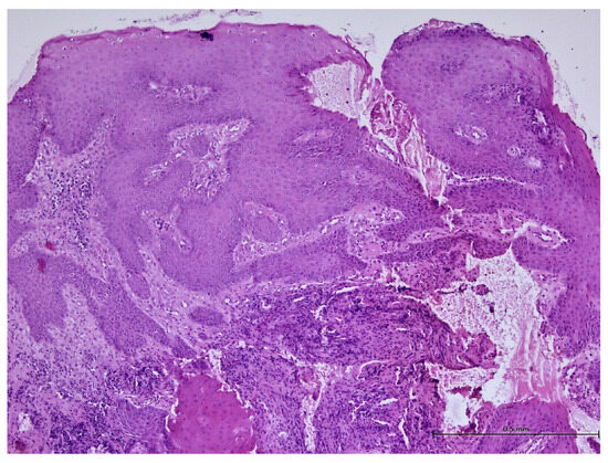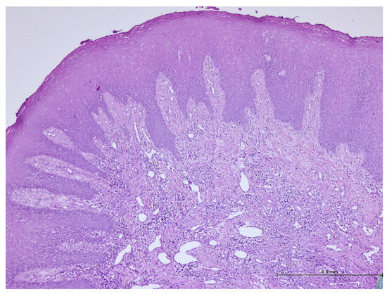 The palatal mucosa was partially covered by keratinized stratified squamous epithelium with foci of parakeratosis. Marked acanthosis of the spinous layer was observed in the areas with a pseudo-epitheliomatous appearance. Acanthosis with elongation of ridges in the spinous layer was also observed. In the connective tissue of the subepithelial layer, there was edema, a small polymorphic inflammatory infiltrate consisting of rare lymphocytes, rare histiocytes, plasma cells, and eosinophilic granulocytes. Numerous small, thin-walled vessels, some with ballooned endothelium and dilated endothelium, with or without the presence of haematocytes, were also visible, along with dilated lymphatic vessels. In the middle of the fragments, marked acanthosis areas showed a keratinization tendency. In eleven cases (n = 11) on the epithelium’s surface, mucus deposits, fibrin-hematic material, and bacterial colonies (bacterial plaque) were observed.