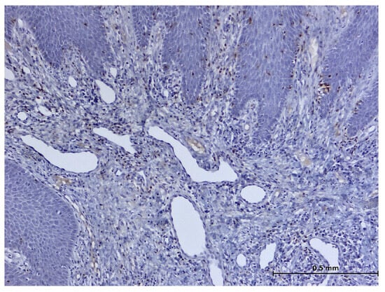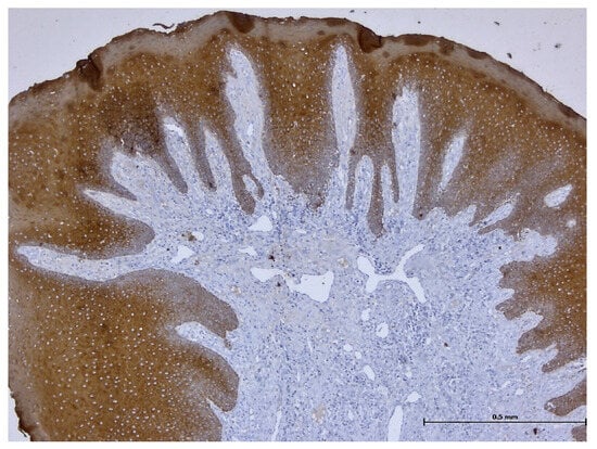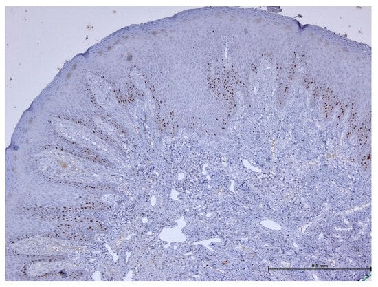 After performing immunohistochemical reactions, the final histopathological diagnosis was reactive acanthosis of the palatal epithelium, likely due to mechanical causes, with a tendency for keratinization (Figure 13, Figure 14, Figure 15, Figure 16, Figure 17 and Figure 18).
