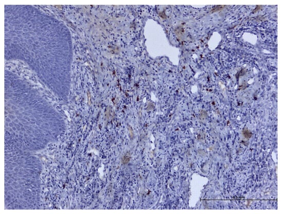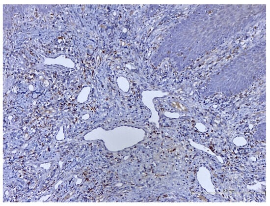 Immunohistochemistry: CD8 reaction shows a moderate number of macrophages (magnification ×100).