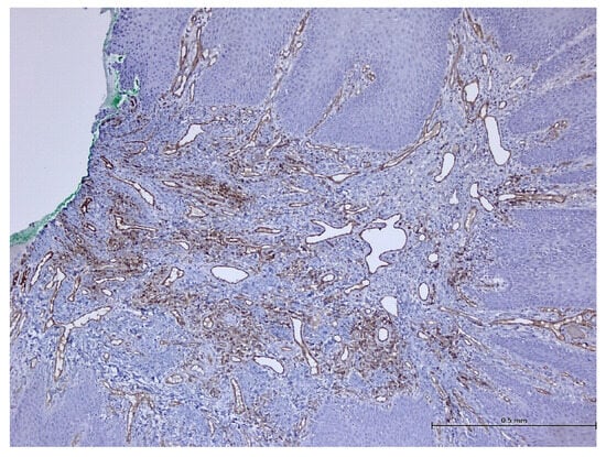 Immunohistochemistry: CD31 reaction marks endothelial cells of blood and lymphatic vessels (magnification ×100).
