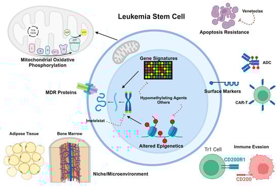 Interactions of LSCs with the surrounding niche have also been shown to play a role in their survival and propagation of AML. LSC-homing to the bone marrow is facilitated by CXCR4/CXCL12 interactions, which are promoted by AML-associated mutations such as TET2 deletions through epigenetic modifications [27]. LSCs utilizing the CXCR4/CXCL12 axis to hide in the bone marrow have been shown to be more resistant to FLT3 inhibitors such as quizartinib [44]. Similarly, LSCs that had adapted to an adipose niche were shown to be resistant to conventional chemotherapeutic agents [42]. The microenvironment also plays a role in the immune evasion of LSCs [45].