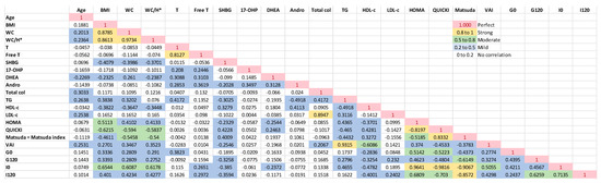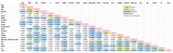 Spearman’s Correlation—Baseline PCOS. Free T (Free Testosterone) X T (Total testosterone) were not considered; HOMA and QUICKI X G0 (fasting plasma glucose) and I0 (fasting plasma insulin); VAI (visceral adipose index) X BMI (body mass index), WC (waist circunference), TG (triglycerides) and HDL–c (HDL cholesterol), as they are part of the calculation formula itself. SHBG = sex hormone binding globulin; 17–OHP = 17 OH progesterone; DHEAS = dehydroepiandrosterone sulfate; Andro = androstenedione; Matsuda = ISI Matsuda; G120 = 2 h OGTT glucose; I120 = 2 h OGTT insulin. * H = height.