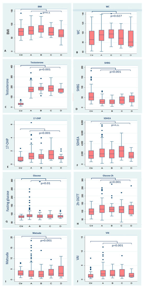 Baseline demographics and clinical exams in PCOS patients, control, and phenotypes groups. (A) (BMI): p-value = 0.023 between control and phenotype D; (B) (WC): p-value = 0.027 between control and phenotype B; (C) (Testosterone): p-value = 0.001 between control and phenotypes A, B, C and D; (D) (SHBG): p-value = 0.01 between control and phenotype B; (E) (17-OHP): p-value = 0.04 between control and phenotype C; (F) (SDHEA): p-value = n.s. (G) (Glucose): p-value = 0.03 between control and phenotype A; (H) (Glucose 2 h): p-value = 0.01 between control and phenotype A and p-value = 0.02 between control and phenotype B; (I) (Matsuda): p-value = 0.01 between control and phenotype A; (J) (VAI): p-value = 0.001 between control and phenotype A. Ctr = control; A = phenotype A; B = phenotype B; C = phenotype C; D = phenotype D; BMI = body mass index; WC = waist circumference; SHBG = sex hormone binding globulin; SDHEA= Dehydroepiandrosterone sulfate; 17-OHP = 17-OHP progesterone; Glucose = Fasting glucose; Glucose 2 h = overload after 75 g glucose. n.s. = non significative.