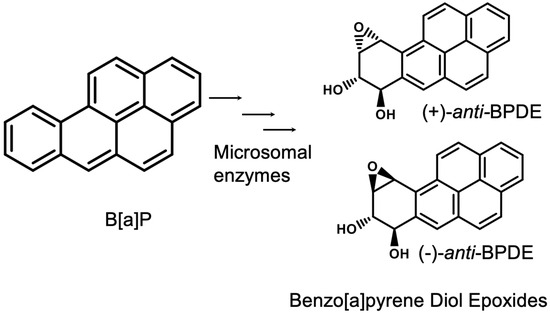 Environment pollutants, such as Polycyclic Aromatic Hydrocarbons (PAHs), have been identified as significant extrinsic factors responsible for the incidence of over 60% of cancer cases [1,2]. This type of pollutant is generated by partial combustion through anthropogenic (e.g., industrial processes and cigarette smoking) and natural (e.g., forest fires and natural petroleum) sources [3]. PAHs are also considered mutagenic and genotoxic [4,5,6]. One PAH, Benzo[a]pyrene (B[a]P), is a typical environmental carcinogen causing lung, liver, and skin cancers [7,8].