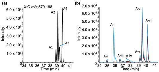 Characterization of the BPDE adduct formed with adenosine (rA-BPDE) based on LC-MS. (a) XIC of rA-BPDE at m/z 570.198. (b) Adenosine exposed to BPDE at varying pHs: pHs 4 (black trace), 6 (red trace), and 9 (blue trace). Seven peaks are labeled at the retention times: 34.94, 35.86, 36.63, 37.50, 39.24, 39.52, and 40.19, mins labeled (A-)i–vii.