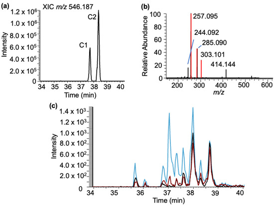 Cytidine–BPDE adducts: Analysis of the LC-MS data for cytidine–BPDE adduct molecular ion (m/z 546.187) revealed two peaks (labeled as C1–C2) in the extracted ion chromatogram (XIC) eluting between 37 and 39 min (Figure 5a). Tandem mass spectra of the molecular ion revealed the presence of minor product ions corresponding to cytidine (m/z 244.092) and the loss of the ribose sugar (m/z 414.144). The other major product ions from both adducts arise from BPDE-specific products (Figure 5b).