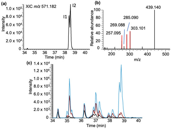 Inosine–BPDE adducts: Analysis of the LC-MS data for inosine–BPDE adduct molecular ion (m/z 571.183) revealed two closely eluting peaks (labeled as I1 and I2) in the extracted ion chromatogram (XIC) eluting at 38.43 and 38.56 min (Figure 6a). Their elution time is different from that of adenosine–BPDE adducts, indicating they are unique inosine–BPDE adducts, and the results observed in the XIC do not arise from the 13C isotope of adenosine–BPDE adducts. Tandem mass spectra of these peaks revealed the major product ion to be associated with the loss of ribose (m/z 439.140), with a very minor product ion corresponding to inosine (m/z 269.088). The other significant product ions (m/z 303.101, 285.090, and 257.095) arise from BPDE-specific fragment ions (Figure 6b).