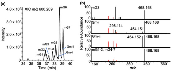 Methylated guanosine–BPDE adducts: Yeast tRNA contains several different methylated guanosines, where the position of methylation can vary on the nucleobase or arise from ribose methylation. The adducts of these positional isomers (m2G, m1G, and m7G) or ribose methylation (Gm) are expected to generate molecular ions with identical m/z values (m/z 600.209). Analysis of the LC-MS data at this m/z value yielded seven peaks (mG1-7) eluting between 36 and 40 min (Figure 7a). Apart from the BPDE-specific fragment ions, m/z 303.101, 285.090, and 257.096, the tandem mass spectra contained product ions such as m/z 468.166 (loss of ribose from mG + BPDE adduct), m/z 454.148 (Gm + BPDE minus loss of 2′-O-methylribose (146.058)), and m/z 298.115 (corresponding to protonated mG resulting from the loss of BPDE). While the loss of ribose (−132 Da) was noticed for almost all XIC peaks, a loss of 146 Da (methylated ribose) was noticed in the regions labeled as Gm-I and Gm-ii, indicating that these two regions contained Gm + BPDE (versus mG + BPDE) adducts (Figure 7b).