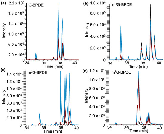 Detection of canonical and methylated G–BPDE adducts in nucleoside standards after exposure to BPDE through selected reaction monitoring. Exposures performed at varying pHs of 4 (black trace), 6 (red trace), and 9 (blue trace). (a) Detection of G–BPDE adducts containing 5 peaks. (b) Detection of m1G-BPDE containing 5 peaks. (c) Detection of m2G–BPDE adducts containing 6 peaks. (d) Detection of m7G–BPDE adducts containing 4 peaks.