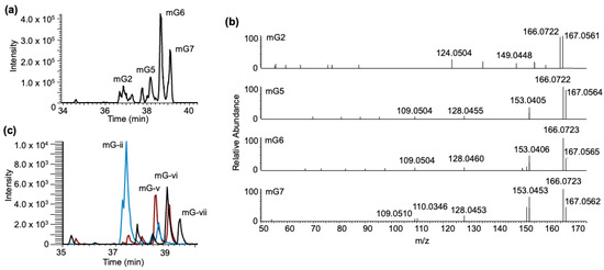To potentially differentiate the isomers of guanine methylations in high-resolution full scan data, we adopted higher-energy collision dissociation (HCD) to identify the presence of methylated nitrogenous base isomer-specific fragment ions in the tandem spectra [40] as shown in Figure 9. Such analysis indicated a tentative assignment of XIC peak mG2 to m7G-BPDE (due to the presence of m/z 124.050). Peaks (mG) 5–7 contained a similar pattern of fragment ions that are expected for m1G-BPDE (due to the presence of m/z 166.072, 153.042, 109.051), with peak mG7 containing the additional identifying fragment (m/z 110.0346) (Figure 9b). The overlayed chromatograms of the SRM analysis of m1G, m2G, and m7G ribonucleoside standards after BPDE exposure produced a similar profile to the one after tRNA exposure (Figure 9c). Peak mG- ii, containing mainly m7G-BPDE, elutes at a similar position as mG2, in which m7G was identified through HCD analysis. Peaks mG5-7 were assigned to m1G; however, m2G has a similar fragmentation profile. There is only one differentiating peak generally found at 57.0453. However, in the profile, this peak is found in relatively low abundance [40].